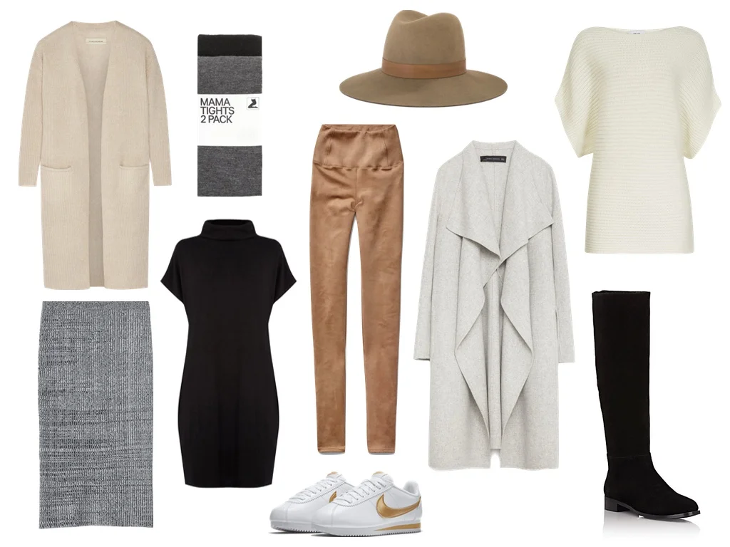 KNITTED CARDIGAN // MATERNITY TIGHTS // WOOL FELT HAT // KNIT JUMPER // COWL TUNIC DRESS // VEGAN SUEDE LEGGINGS // COAT // KNIT SKIRT // LEATHER SNEAKERS // SUEDE KNEE BOOTS