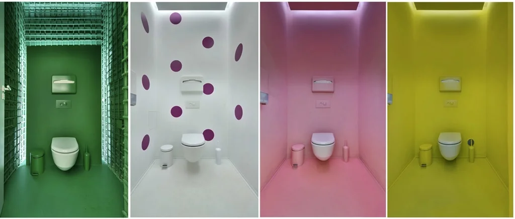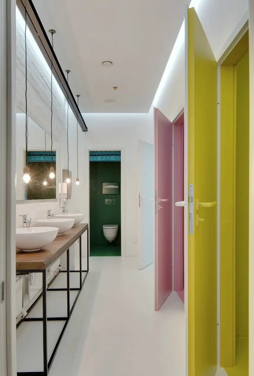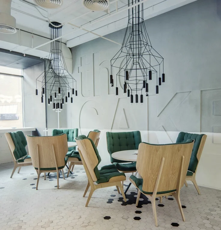 Today I'm 32 and since I'm jonesing for some birthday cake, I thought I'd start off the day with a tour of The Cake - the coolest pastry shop in Kiev. Designed by 2B.Group, this modern cafe features a cool white backdrop juxtaposed with bold colors and graphic design features. Center stage is a giant hot pink Koons-like balloon dog (that respectfully states "only looks like a Koons dog but is not"). The tables are surrounded by tufted wing chairs while geometric wire chandeliers loom overhead. The candy-colored bathrooms are also notable. Each one features a shocking punch of monochromatic color sure to boost any mood. I'll blow out a candle to that!
