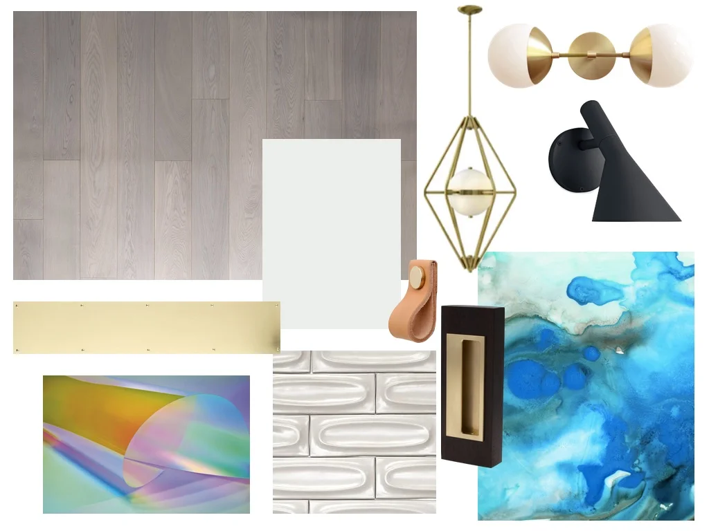 WHITE OILED OAK FLOORING // DECORATOR'S WHITE PAINT // BRASS PENDANT // HAND-BLOWN GLASS + BRASS SCONCE // OUTDOOR WALL SCONCE // BRASS KICK PLATE // LEATHER PULL // RECTANGULAR BRASS PULL // DICHROIC GLASS FINISH FILM // OVAL TILE // WATERCOLOR WALLPAPER