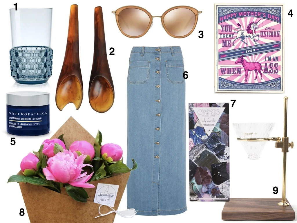 1. TUMBLER // 2. SALAD SERVERS // 3. SUNGLASSES // 4. CARD // 5. CHERRY ENZYME PEEL // 6. DENIM SKIRT // 7. CHOCOLATE BAR // 8. PEONY BOUQUET // 9. COFFEE POUR OVER STAND