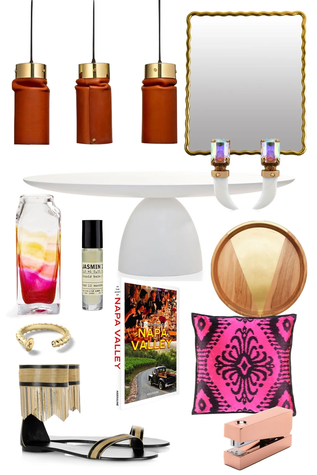 LEATHER PENDANTS // MIRROR // CRYSTAL EARRINGS // DINING TABLE // HANDBLOWN GLASS VASE // ROLL-ON PERFUME // TEAK TRAY // GOLD SCREW RING // IN THE SPIRIT OF NAPA VALLEY // SILK THROW PILLOW // CHAIN-TRIMMED SANDALS // COPPER STAPLER