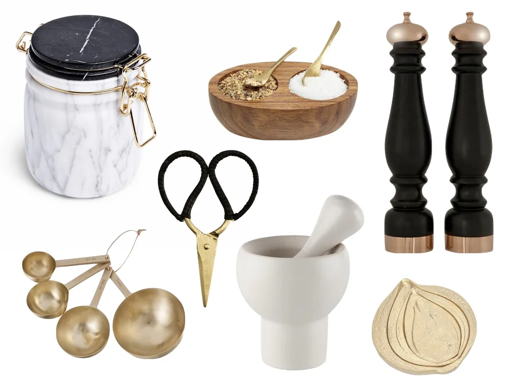 MARBLE JAR // ROSEWOOD SALT & PEPPER CELLAR // SALT & PEPPER MILL SET // BRASS MEASURING SPOONS // BRASS HERB SCISSORS // STONEWARE MORTAR & PESTLE // BRASS ONION TRIVET