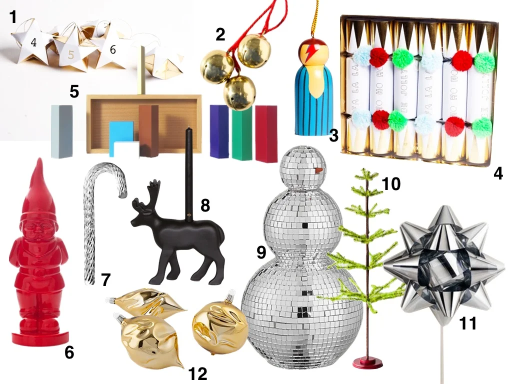 1. STAR GARLAND ADVENT CALENDAR // 2. OVERSIZED BRASS BELLS // 3. DAVID BOWIE ORNAMENT // 4. POM CHRISTMAS CRACKERS // 5. CONTEMPORARY NATIVITY SET // 6. GNOME // 7. CANDY CANE ORNAMENT // 8. REINDEER CANDLE // 9. DISCO SNOWMAN // 10. MODERN CHRISTMAS TREE // 11. GIANT BOW LAMP // 12. WRINKLE ORNAMENT