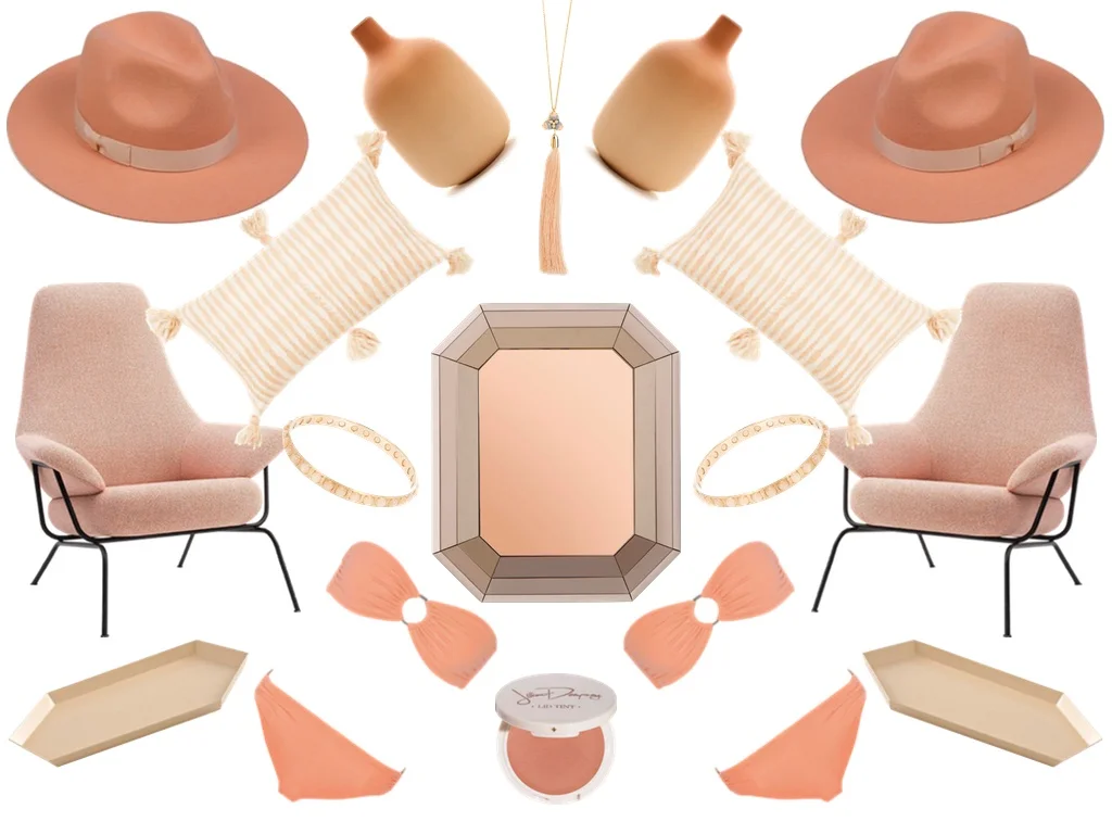 FEDORA // CERAMIC VASE // TASSEL NECKLACE // COTTON PILLOW // ARMCHAIR // GEMSTONE BANGLE // JEWEL MIRROR // PAINTED STEEL TRAY // BIKINI // EYESHADOW