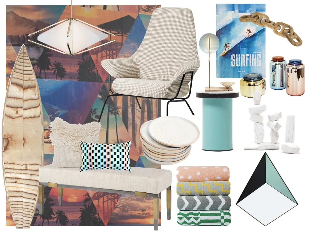 WALLPAPER // BRASS + GLASS PENDANT // ARMCHAIR // TABLE LAMP // MARBLE TOP END TABLE // COFFEE TABLE BOOK // CARVED WOOD CHAIN // HAND-BLOWN GLASS CONTAINERS // DECORATIVE BIRCH SURFBOARD // BRASS + BRONZE UPHOLSTERED BENCH // KNIT WOOL CUSHION // HANDWOVEN COTTON PILLOW // GRADIENT PLATES // BALANCING BLOCKS // TOWELS // PYRAMID MIRROR