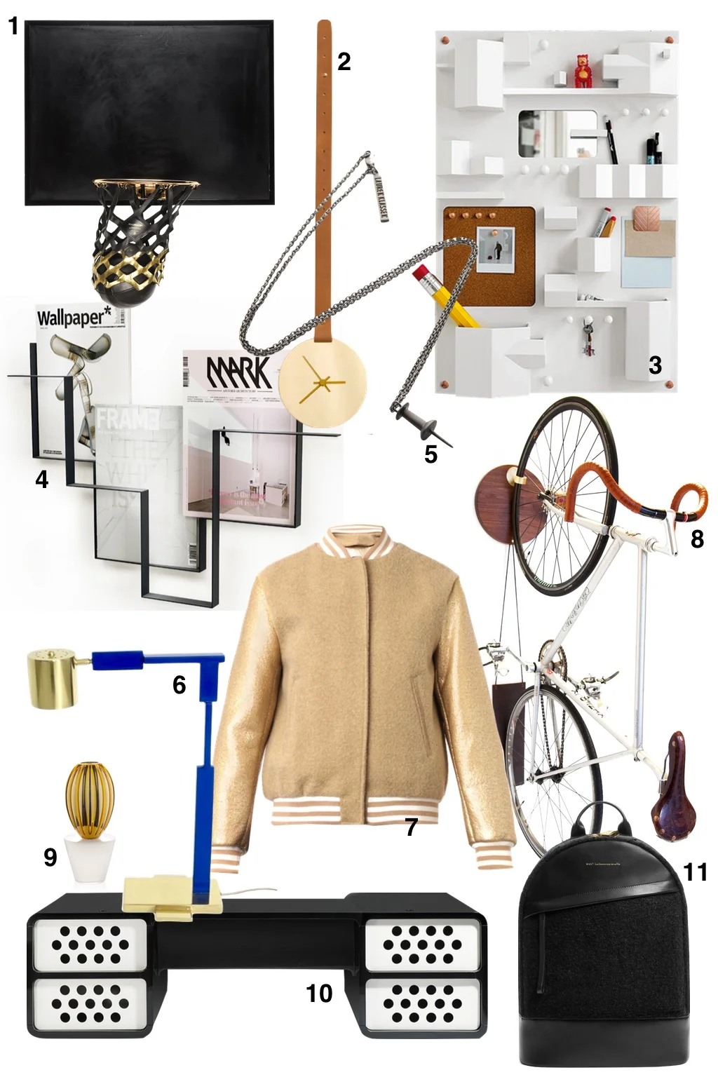 1. INDOOR MINI BASKETBALL HOOP // 2. CLOCK // 3. WALL ORGANIZER // 4. MAGAZINE RACK // 5. PUSH PIN NECKLACE // 6. DESK LAMP // 7. VARSITY JACKET // 8. BIKE MOUNT // 9. CACTUS SCULPTURE // 10. DESK // 11. BACKPACK